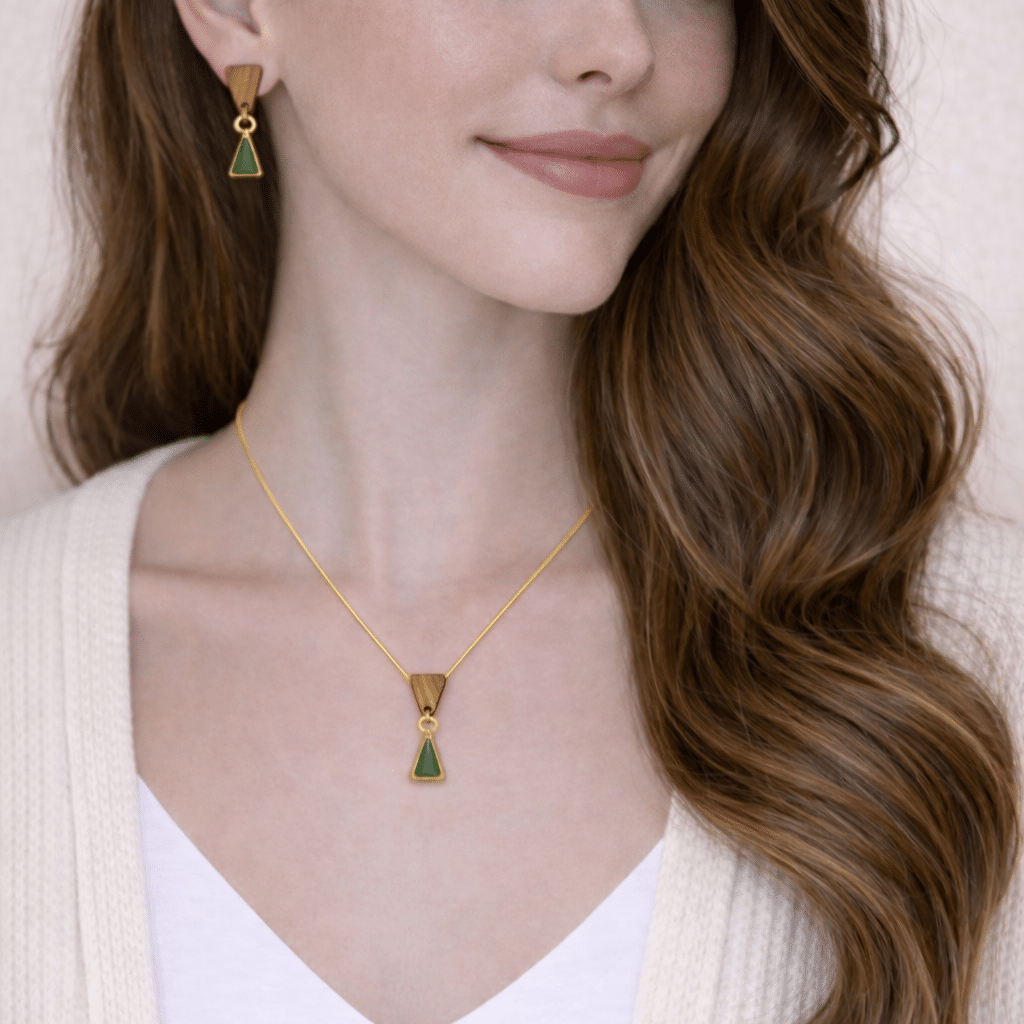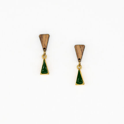 Handmade earrings & pendant made of olive wood in the shape of two pyramids. They are combined with metal frame in gold color with discreet plating in two colors. An epilogue that will add chic to your look.
