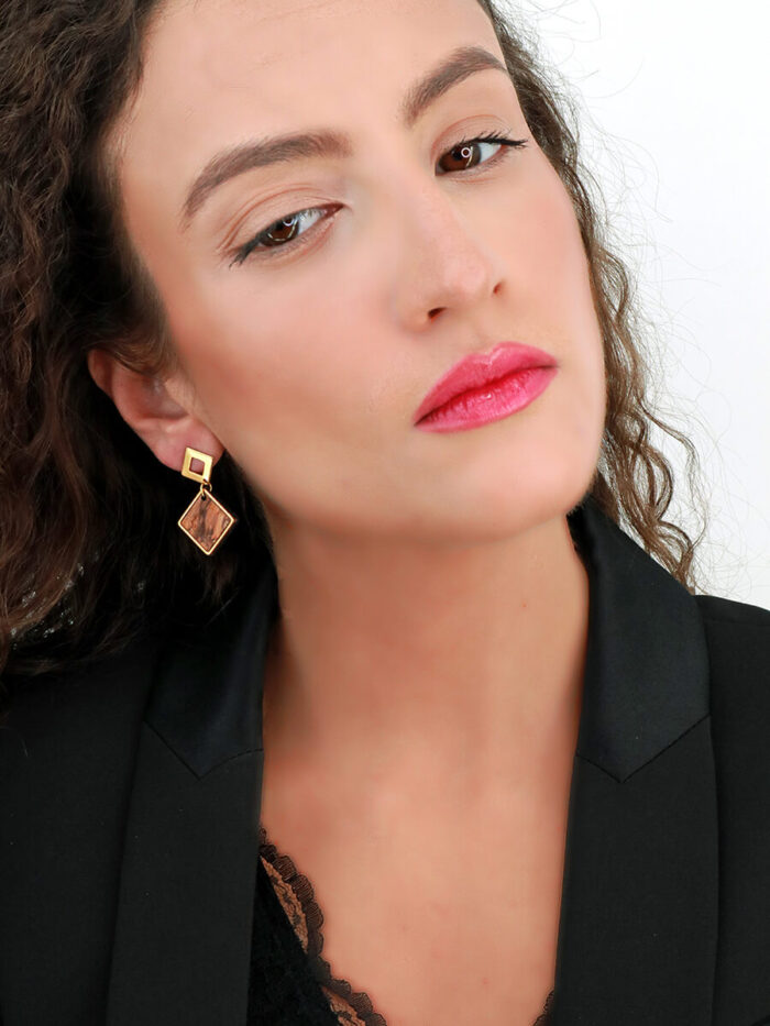 Handmade olive wood earrings in rhombus shape. They are combined with a metal item made of stainless steel in gold and silver color. They give your look a touch of modern mood.