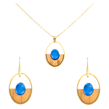 Χειροποίητα σκουλαρίκια & μενταγιόν από ελαιόξυλο σε σχήμα έκκεντρου κύκλου. Συνδυάζονται με μεταλλικό στοιχείο από ανοξείδωτο ατσάλι σε ασημί ή χρυσό χρώμα κι ένα εντυπωσιακό στρας σε 5 χρωματικές επιλογές. Μπορούν να φορεθούν σε μια casual ή μια επίσημη εμφάνιση.