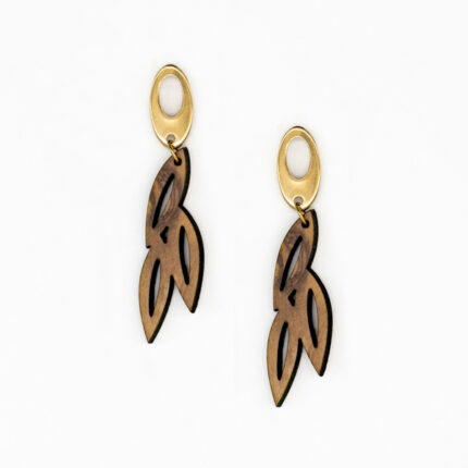 Χειροποίητα σκουλαρίκια από ελαιόξυλο σε σχήμα δύο ρόμβων. Συνδυάζονται με μεταλλικό στοιχείο από ανοξείδωτο ατσάλι σε χρυσό ή ασημί χρώμα. Για όσες επιλέγουν τα μεγάλα κοσμήματα για να δώσουν μια ενδιαφέρουσα άποψη στην εμφάνισή τους.