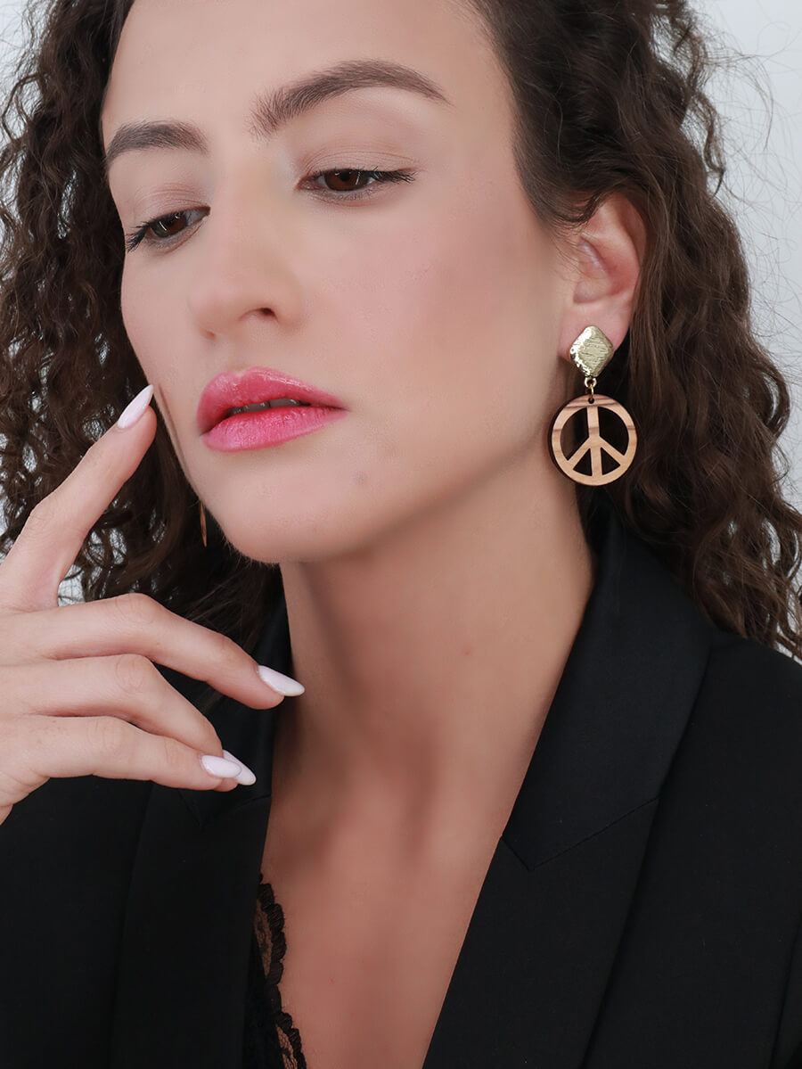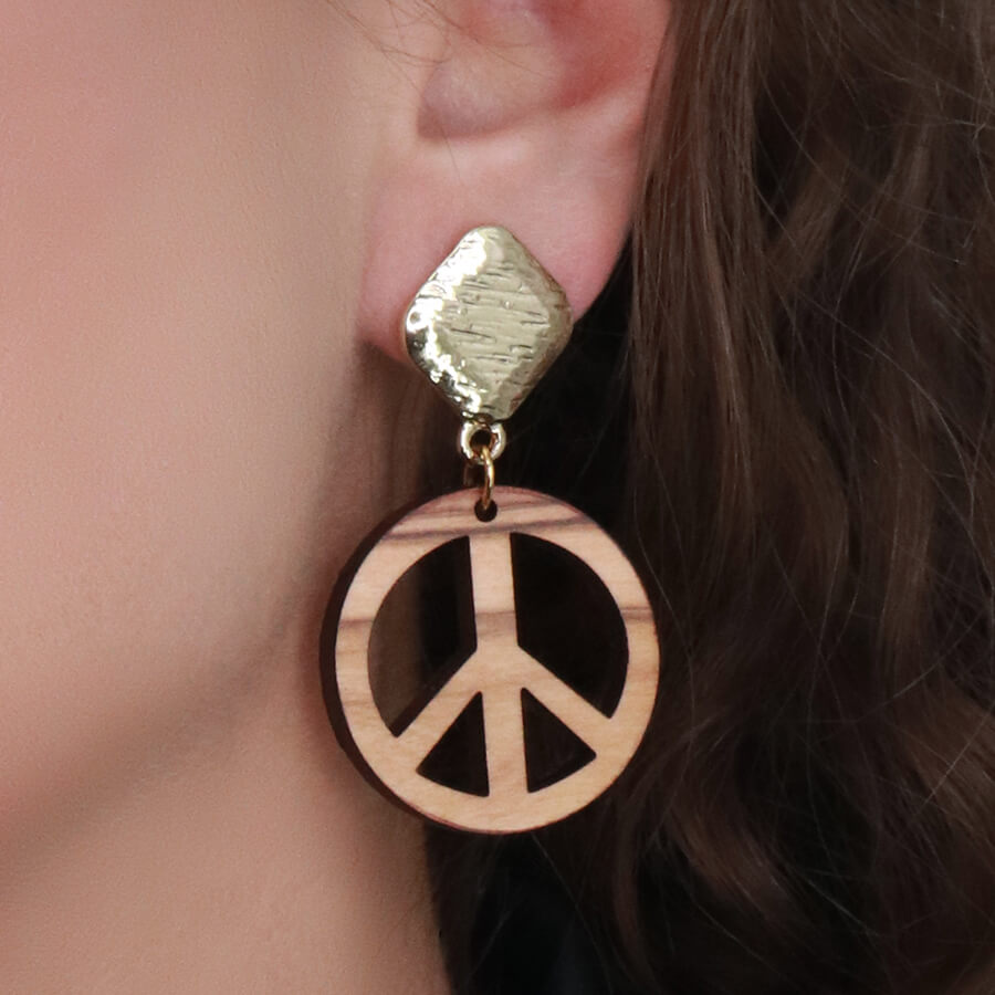 Χειροποίητα σκουλαρίκια από ελαιόξυλο με το σήμα της ειρήνης. Συνδυάζονται με μεταλλικό στοιχείο από ανοξείδωτο ατσάλι σε χρυσό κι ασημί χρώμα ή για πιο ποπ εμφανίσεις επισμαλτωμένα σε 8 αποχρώσεις. Αυτό τo boho chic ζευγάρι είναι μία εξαιρετική επιλογή για να συμπληρώσετε το look σας.