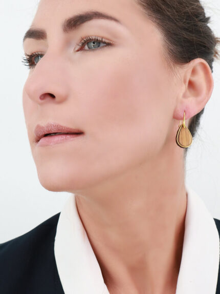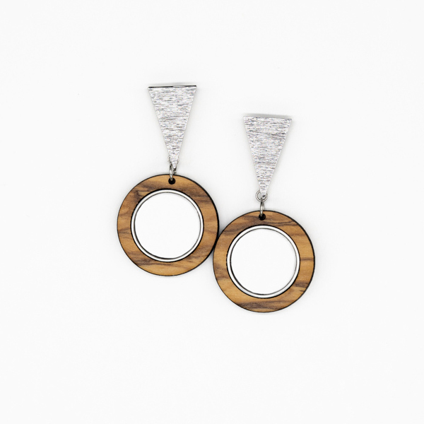 Χειροποίητα σκουλαρίκια από ελαιόξυλο σε σχήμα κύκλου. Συνδυάζονται με ένα εντυπωσιάκο μεταλλικό τρίγωνο στοιχείο από ανοξείδωτο ατσάλι σε χρυσό κι ασημί χρώμα. Για όσες επιλέγουν τα μεγάλα κοσμήματα για να δώσουν μια ενδιαφέρουσα άποψη στην εμφάνισή τους.