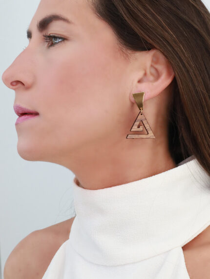 Χειροποίητα σκουλαρίκια από ελαιόξυλο σε σχήμα κύκλου. Συνδυάζονται με ένα εντυπωσιάκο μεταλλικό τρίγωνο στοιχείο από ανοξείδωτο ατσάλι σε χρυσό κι ασημί χρώμα. Για όσες επιλέγουν τα μεγάλα κοσμήματα για να δώσουν μια ενδιαφέρουσα άποψη στην εμφάνισή τους.