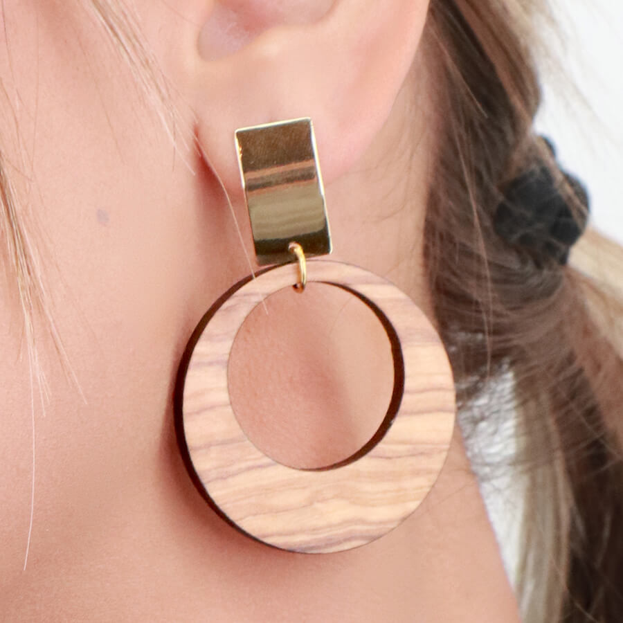 Γεωμετρικά σκουλαρίκια από ξύλο ελιάς Μετατοπισμένος Κύκλος