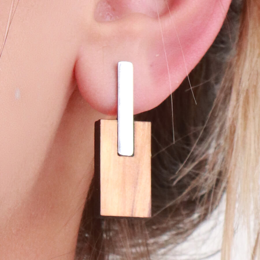 Χειροποίητα ορθογώνια σκουλαρίκια από ελαιόξυλο. Συνδυάζονται με ένα διακριτικό μεταλλικό στοιχείο από ανοξείδωτο ατσάλι σε χρυσό κι ασημί χρώμα. Ένα must have αξεσουάρ για τα fashion girls!