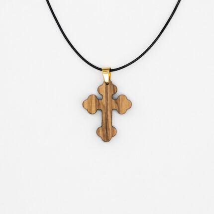 Χειροποίητος unisex σταυρός από ελαιόξυλο και μεταλλικό κρέμασμα από ανοξείδωτο ατσάλι σε χρυσό κι ασημί χρώμα. Διατίθεται με κηρωμένο κορδόνι ρυθμιζόμενου μήκους ή ανοξείδωτη ατσάλινη ντίζα 40εκ με διάφανο περίβλημα.