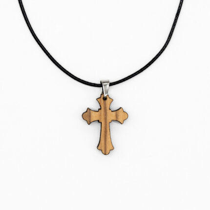 Χειροποίητος unisex σταυρός από ελαιόξυλο και μεταλλικό κρέμασμα από ανοξείδωτο ατσάλι σε χρυσό κι ασημί χρώμα. Διατίθεται με κηρωμένο κορδόνι ρυθμιζόμενου μήκους.
