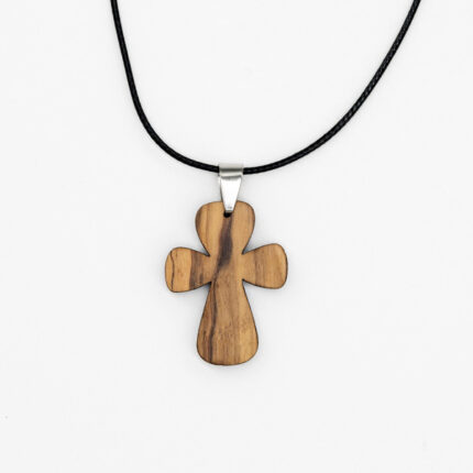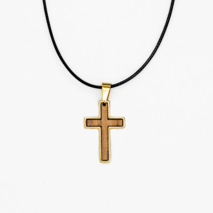 Χειροποίητος unisex σταυρός από ελαιόξυλο και μεταλλικό κρέμασμα από ανοξείδωτο ατσάλι σε χρυσό κι ασημί χρώμα. Διατίθεται με κηρωμένο κορδόνι ρυθμιζόμενου μήκους.