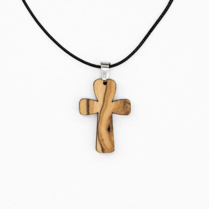 Χειροποίητος unisex σταυρός από ελαιόξυλο και μεταλλικό κρέμασμα από ανοξείδωτο ατσάλι σε χρυσό κι ασημί χρώμα. Διατίθεται με κηρωμένο κορδόνι ρυθμιζόμενου μήκους.